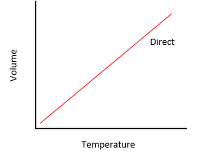 $$ V \propto T$$ $$ V = kT $$ $$ k = \frac{V}{T} $$ $$ \text{The mathematical expression is}; $$ $$ \frac{V_1}{T_1} = \frac{V_2}{T_2} $$ $$\text{Note: Always covert to kelvin scale} $$ $$ K = (°C + 273) $$Graphical representation