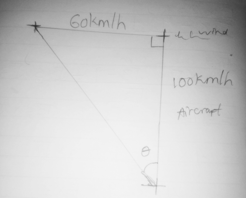 An aircraft attempts to fly due North at 100km/h. If the wind blows against it from east to west at