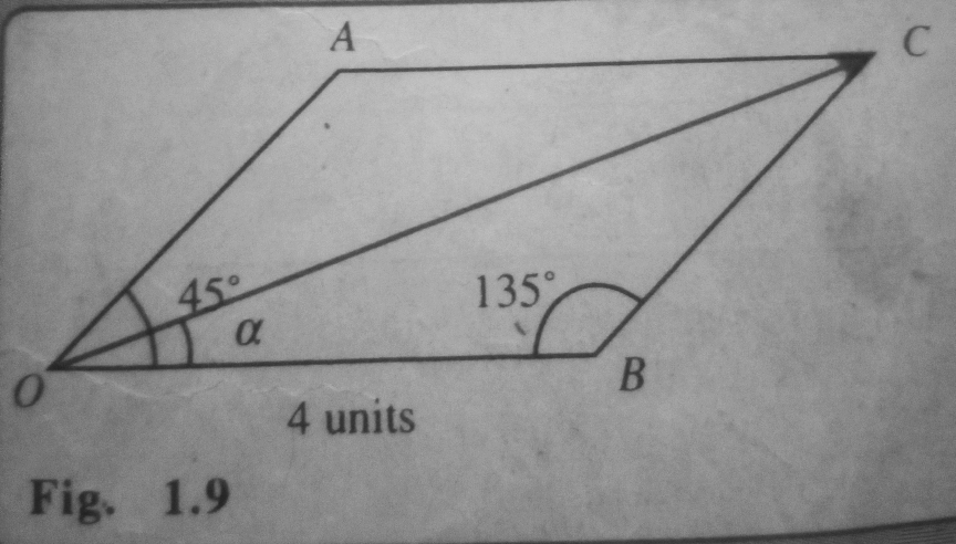 $$ \alpha = tan^{-1}(\frac{3sin45}{4 + 3cos45}) $$