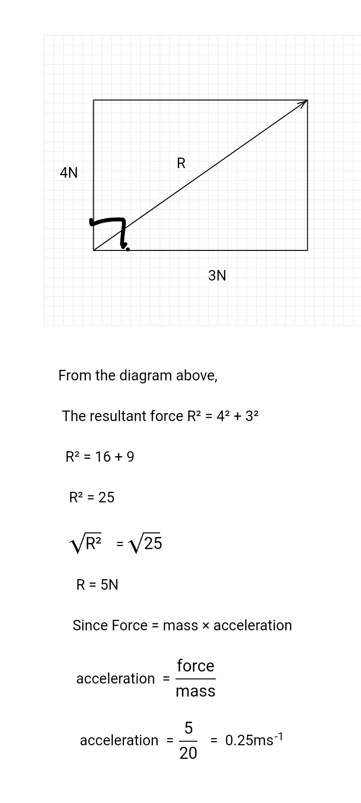 A body of mass 20kg is set in motion by two forces 3N and 4N acting at right angles to each other. Determine